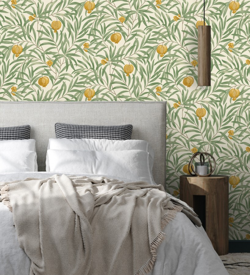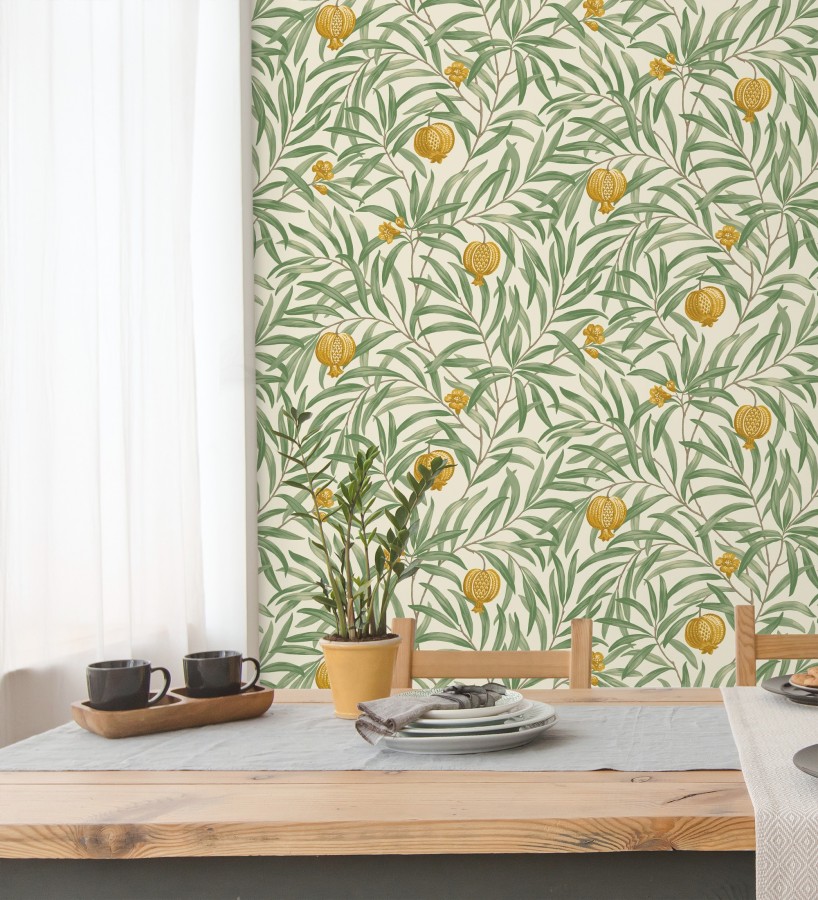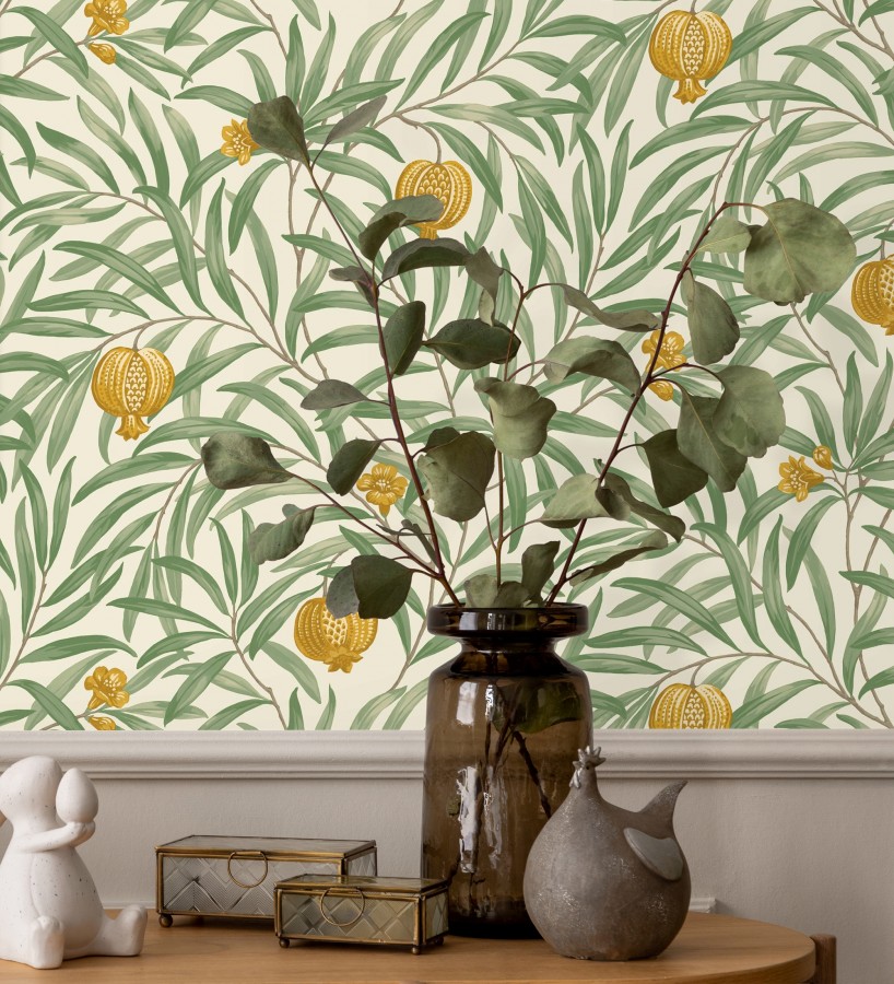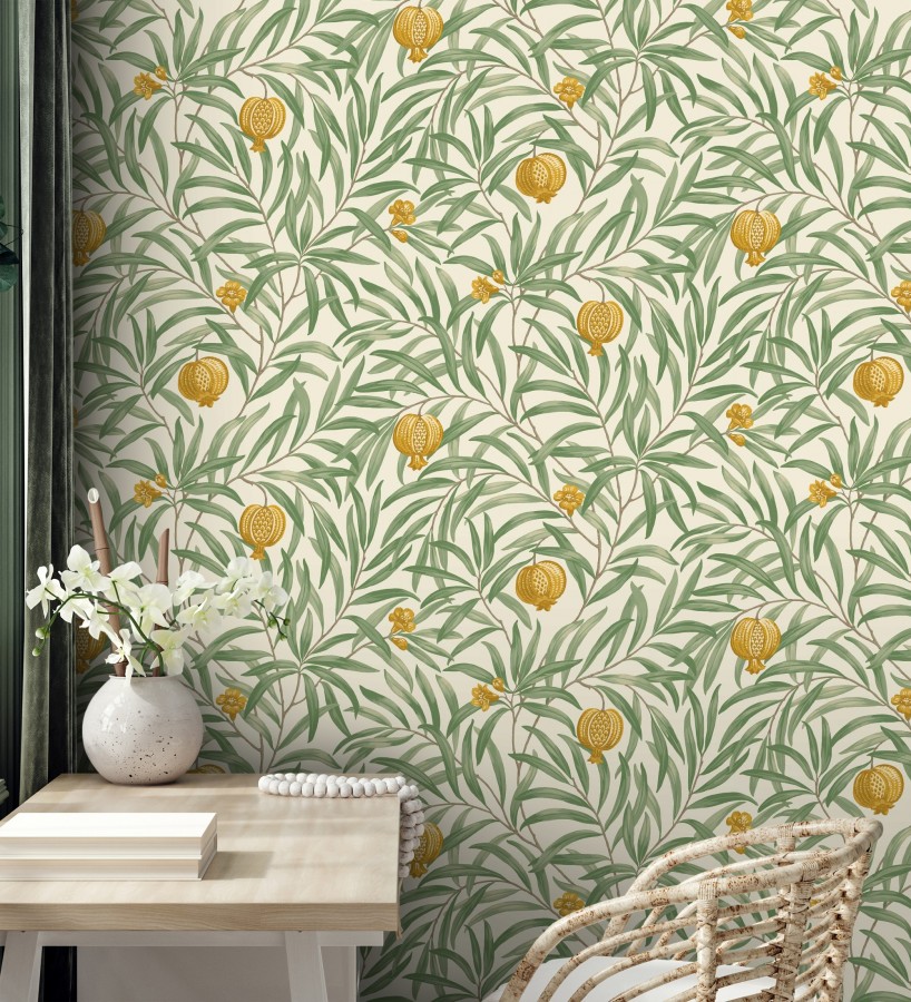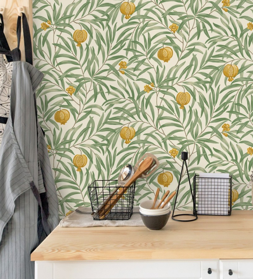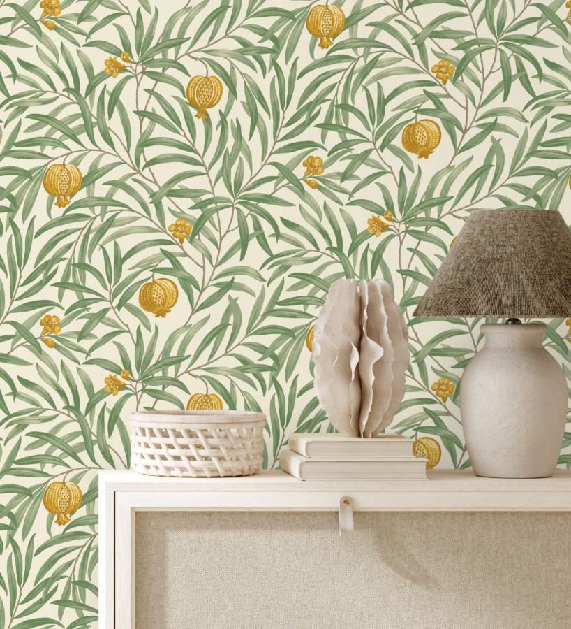 Papel pintado para pared de frutos ocre y hojas verde fondo marfil claro Parisian Fruit 682885
