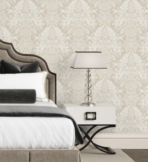 Papel pintado para pared damasco artístico con flores y pájaros fondo beige Charlotte Heritage 683660