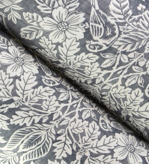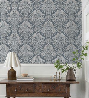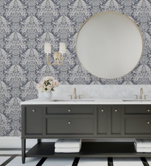 Papel pintado para pared damasco artístico con flores y pájaros fondo gris plomo azulado Charlotte Heritage 683661