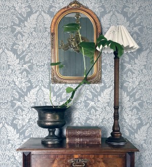 Papel pintado para pared damasco artístico con flores y pájaros fondo azul glaciar Charlotte Heritage 683662