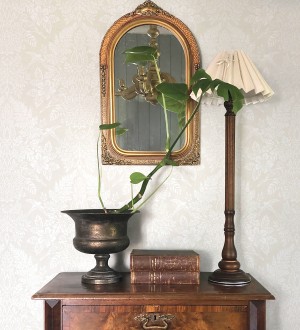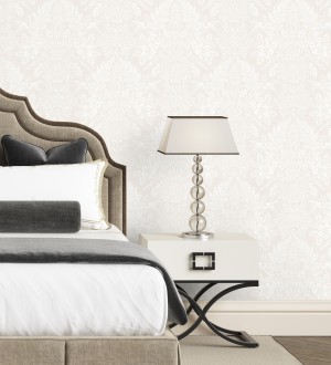 Papel pintado para pared damasco artístico con flores y pájaros fondo nácar blanco Charlotte Heritage 683663