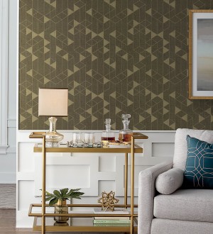 Papel pintado geométrico de hojas tropicales con líneas metalizado estilo Art Decó -
