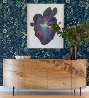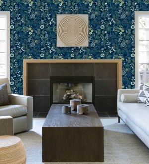 Papel pintado de flores silvestres con margaritas y amapolas fondo azul turquesa -