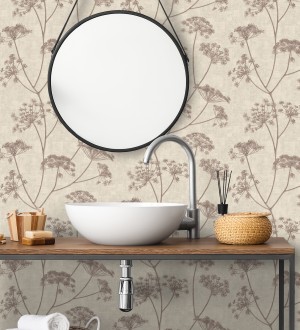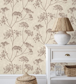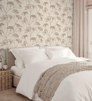 Papel pintado para pared de hojas tono berenjena con fondo textil en relieve Marlow Wildflower 683657