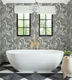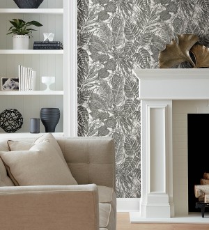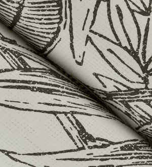 Papel pintado para pared hojas de selva color negro sobre fondo tejido en fibras vegetales Midnight Palms 683814