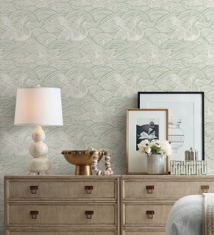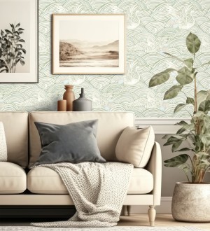 Papel pintado para pared grullas y ondas estilo japonés acuarela tonos verdes Mila Winged 683957