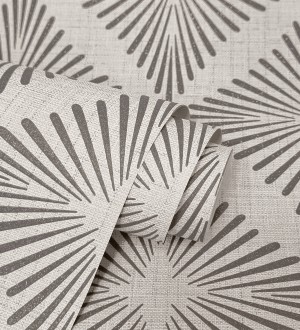 Papel pintado geométrico de líneas plata metalizadas fondo gris claro mate estilo Art Decó -