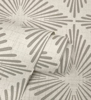 Papel pintado geométrico de líneas plata metalizadas fondo gris claro mate estilo Art Decó -