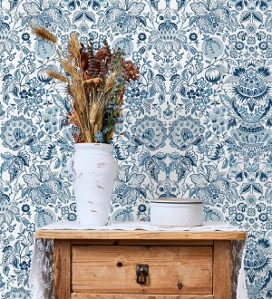 Papel pintado para pared de granadas y jarrones color azul porcelana Sabine Deft 683732