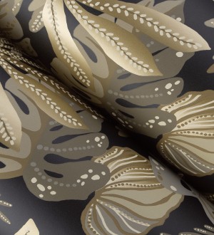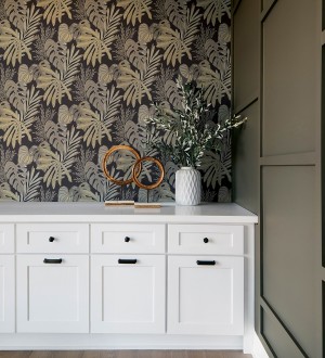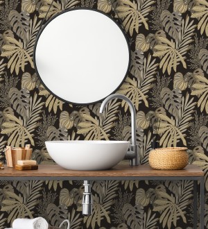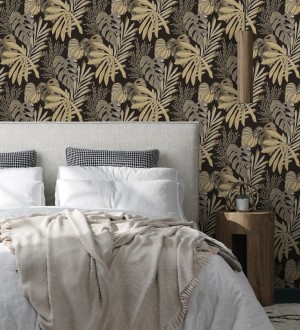 Papel pintado botánico con grandes hojas de estilo étnico colores negro y blanco -