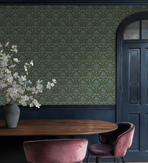 Papel pintado para pared damasco botánico verde bosque y ocre Scott Morrisian 683670