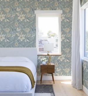 Papel pintado para pared garza y flora exótica azul bruma Seraphina Garden 683805