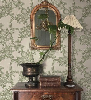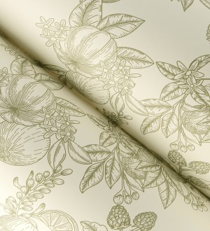 Papel pintado para pared de frutos y hojas color verde fondo crema Sicily Pomm 683675