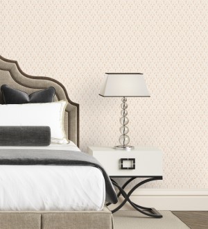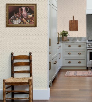 Papel pintado de flores pequeñas con textura entelada en colores malva y beige fondo blanco -
