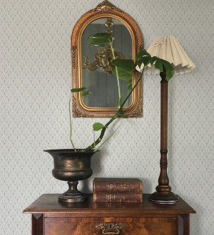 Papel pintado de flores pequeñas con textura entelada en colores malva y beige fondo blanco -