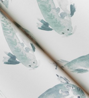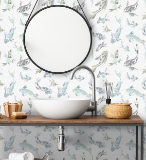 Papel pintado para pared de peces koi tonos verde agua estilo japonés acabado acuarela Yoshi Lucky 683962